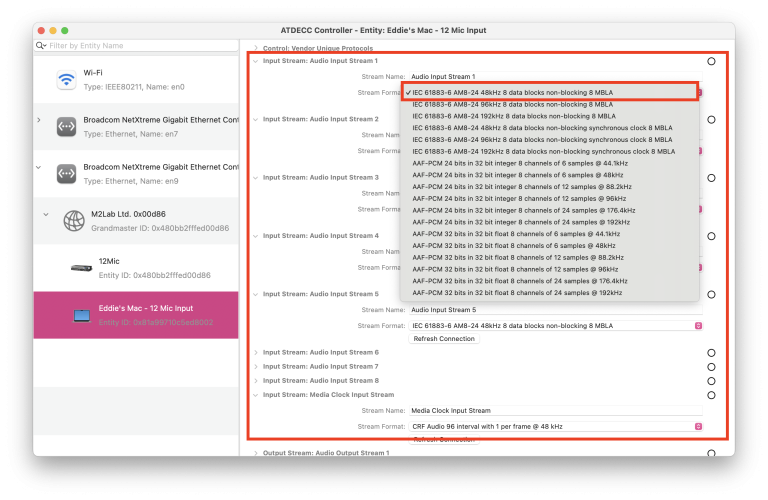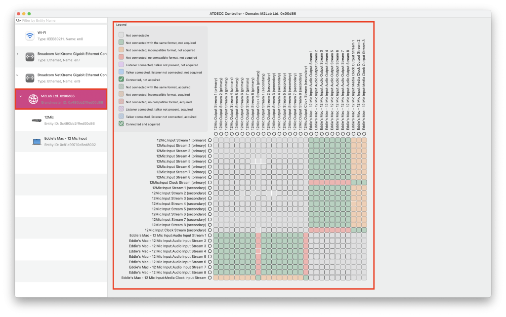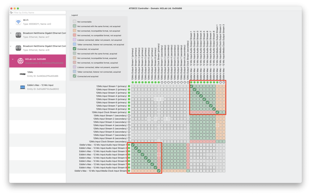 You’ll see that the cells which corroborate my 12 mic and Mac’s inputs, outputs and media clocks are green, meaning the formats match. As they’re green, I can start connecting the AVB streams of both devices together.