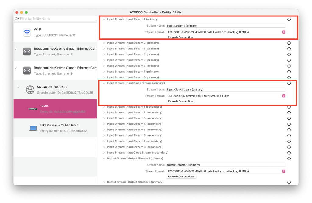 Let’s now take a look at the 12 mic. We’ll need to make sure both entities have matching input, output and clock stream formats.