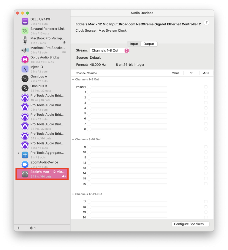 I’ve made sure to connect the corresponding input, output and clock streams from the 12 mic to my Mac’s AVB entity. Now this is all connected, we can head back to Audio MIDI setup and voila – you’ll now see my Mac’s AVB entity is available as a core audio device. As we’ve linked up the I/O and clock streams together, anything that is entering my 12 mic will appear as an input in my 12 mic, alternatively, any audio travelling to the outputs of my Mac’s AVB entity device, will then travel to my 12 mic’s outputs.