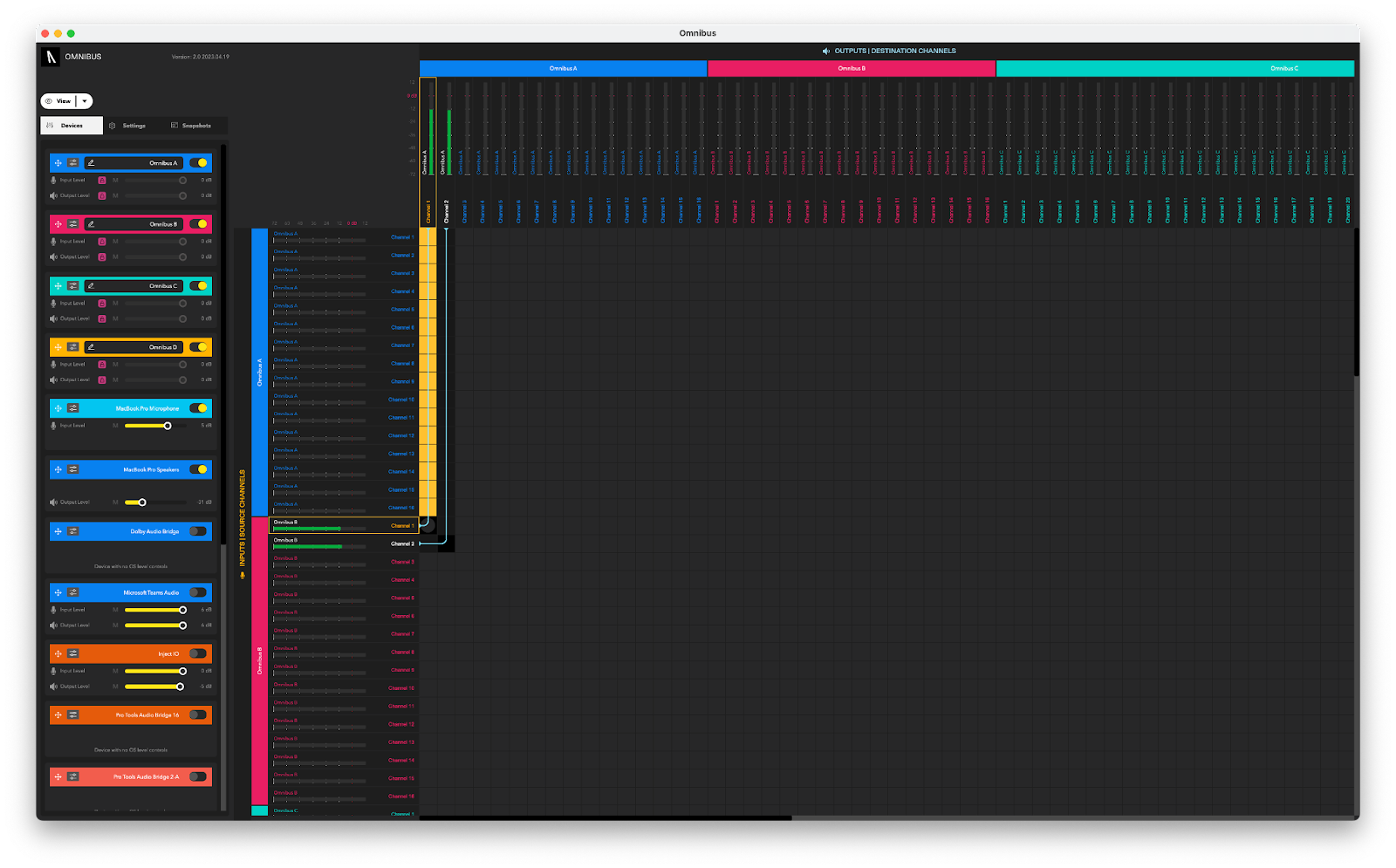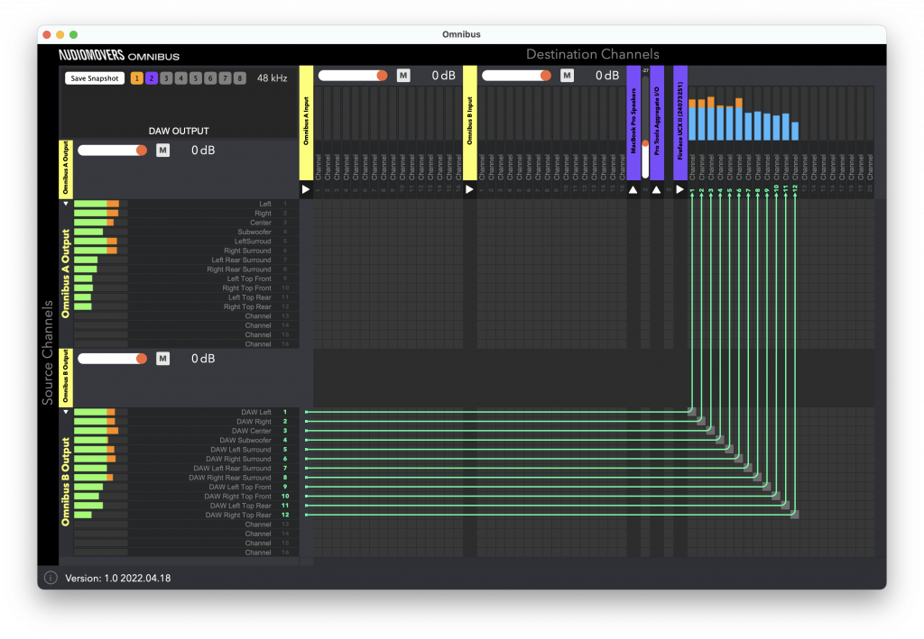 OMNIBUS has an easy-to-use routing matrix, allowing you to simply click the connections between devices you want to make. It also allows you to save and recall complex routing setups with ‘snapshots’, which you can label for ease of finding in future and also has precise metering and support for hardware inputs and outputs meaning it can adapt to even the most demanding scenarios.